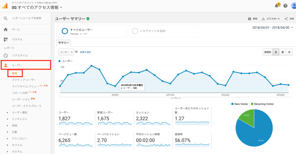 アナリティクスの左側のメニューから「ユーザー」→「概要」を選択すると、サイト全体の訪問者の概要を確認することができます。