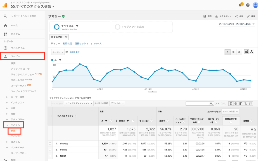 すると、先ほどのサイト全体の訪問者概要が、デバイス別データに分けてみることができます。