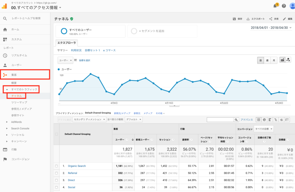 左メニューの「集客」タブから「すべてのトラフィック」→「チャネル」を選択すると、ユーザーはどのようにしてこのサイトへ訪問したのか?(流入経路)のデータを見ることができます。