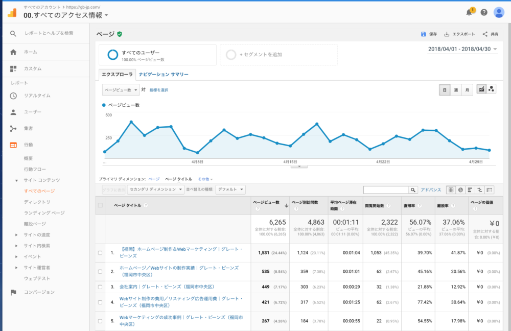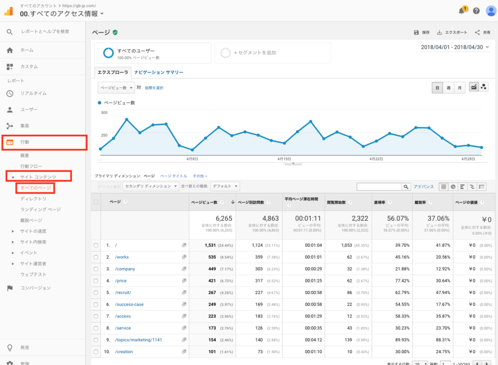 「行動」タブから「サイトコンテンツ」→「すべてのページ」を選択すると、ページ別のデータを見ることができます。