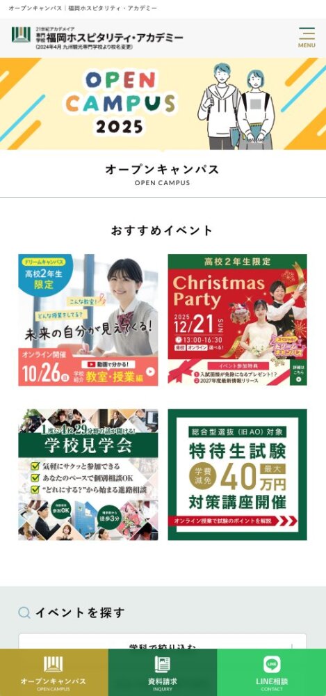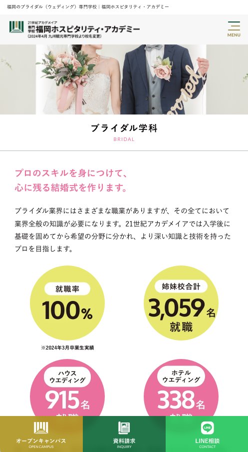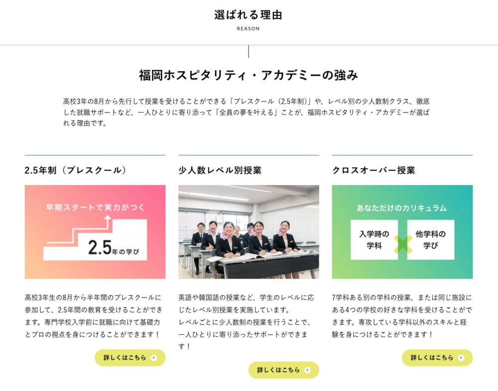 その結果を踏まえて、「選ばれる理由」として、福岡ホスピタリティ・アカデミーの強みを7つにまとめてコンテンツ化しています。