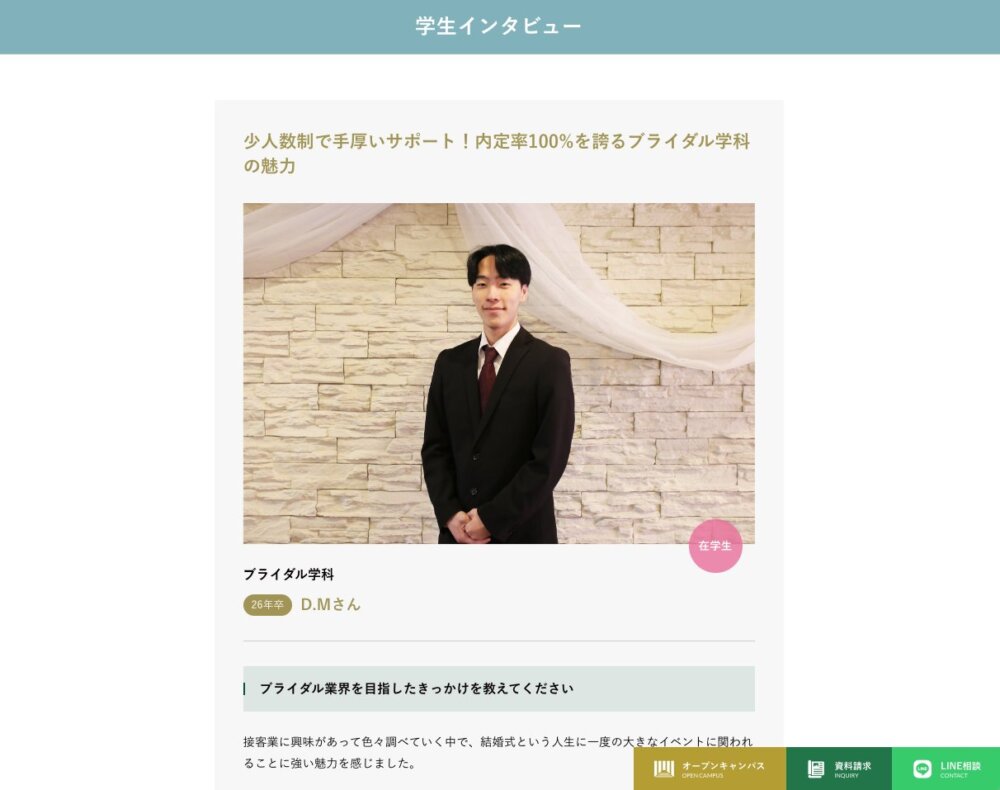 さらに、インタビュー内容を「学生インタビュー」としてページに落とし込み、専門学校選びで悩んでいる高校生などに、先輩から魅力を語ってもらうコンテンツとしています。